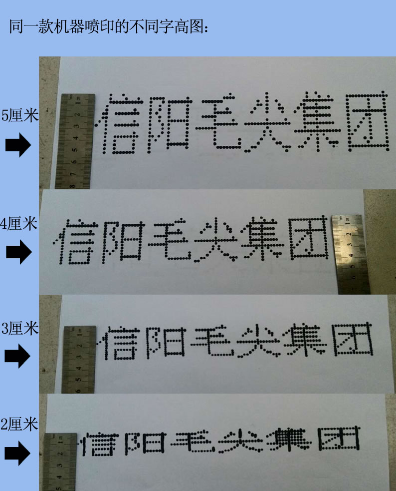 產品特點: 1、體積小巧,機身重2.6Kg,噴頭超輕。 2、字符高度任意調節5MM-60MM區間任意調節 3、拼音輸入法,操作方便 4、氣液分離,保證氣泵氣路不被墨水堵塞 5、四輪設計,可噴平面,弧面,管壁,等任何不規則面 6、輪距可調,可卡不同粗細管徑的管材 7、4.3寸彩色液晶屏,人性化操作 特殊功能介紹:1、機器特有的高度調節功能,噴頭設計為圓形,所以可以將噴頭調節一個角度,然后在主機里設定一個跟這個角度相對應的斜率,通過編碼器給出同步信號,打印出比原字高矮的字符來,值得提出的是改變字符高度的同時不減少噴印的點數,如圖所示: